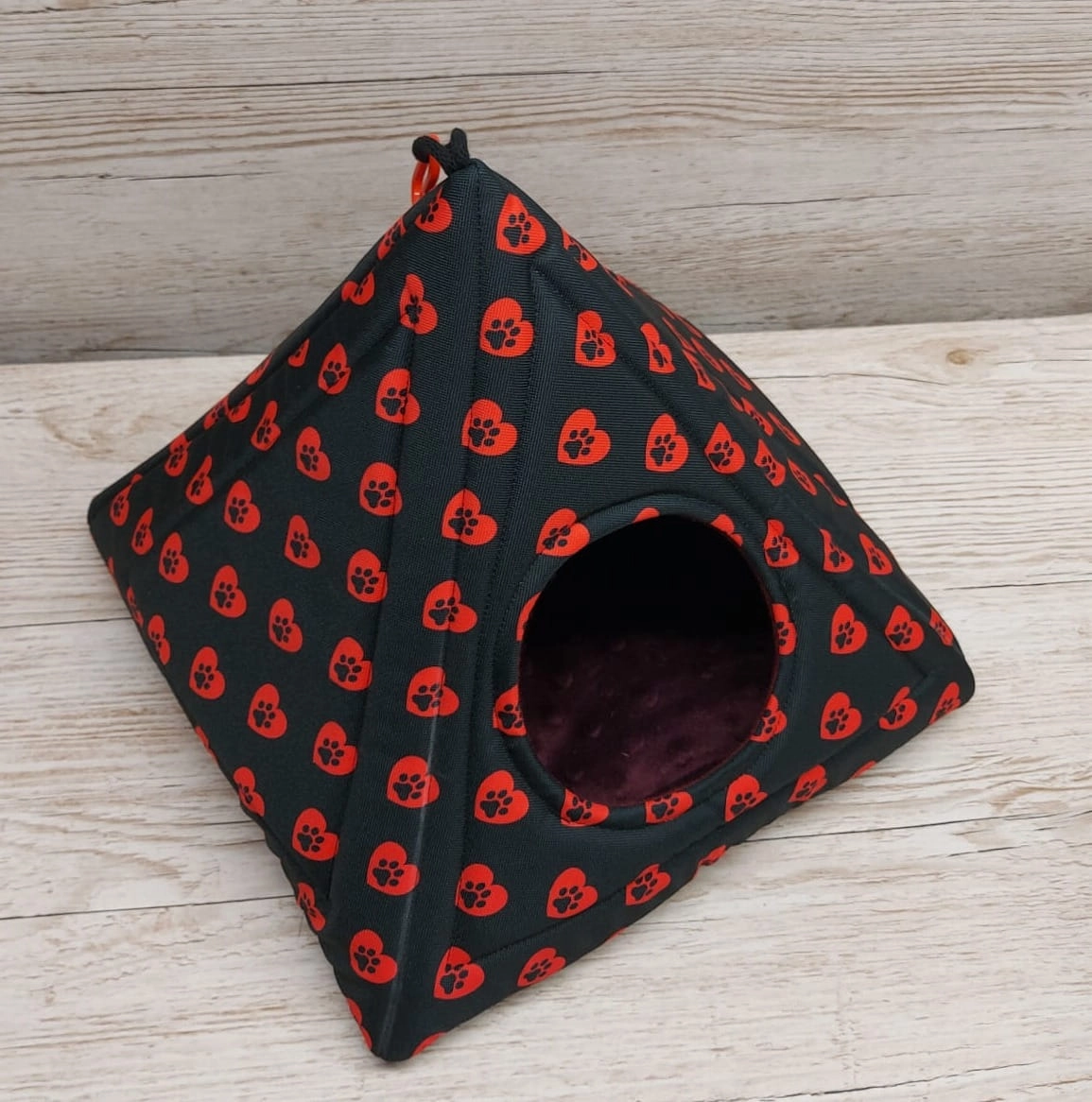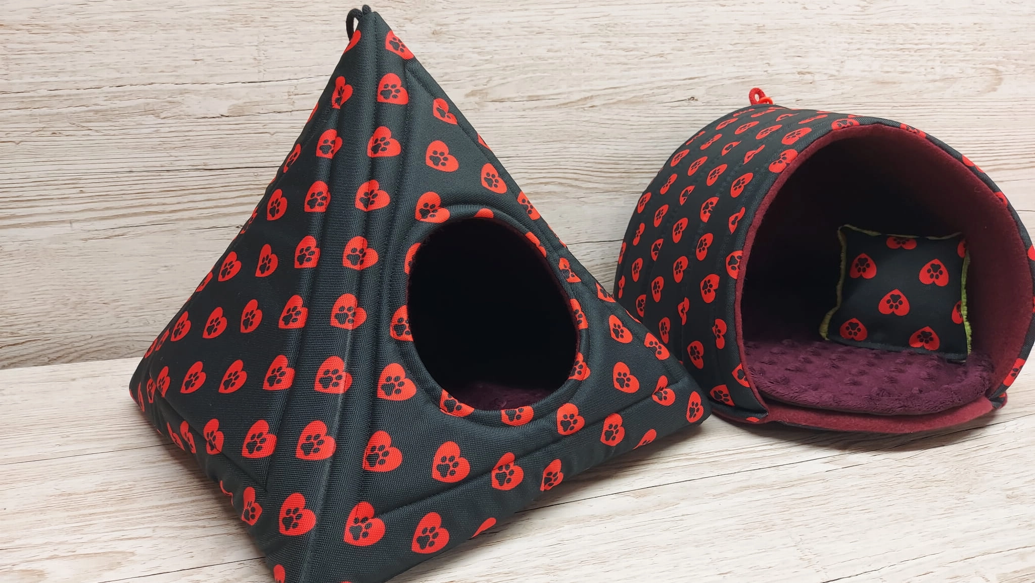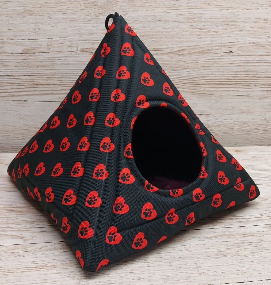 Domek Piramida 30x30 - rewolucyjne legowisko serca czerwone na czarnymwzór wodoodporny z poduszką minky (1)